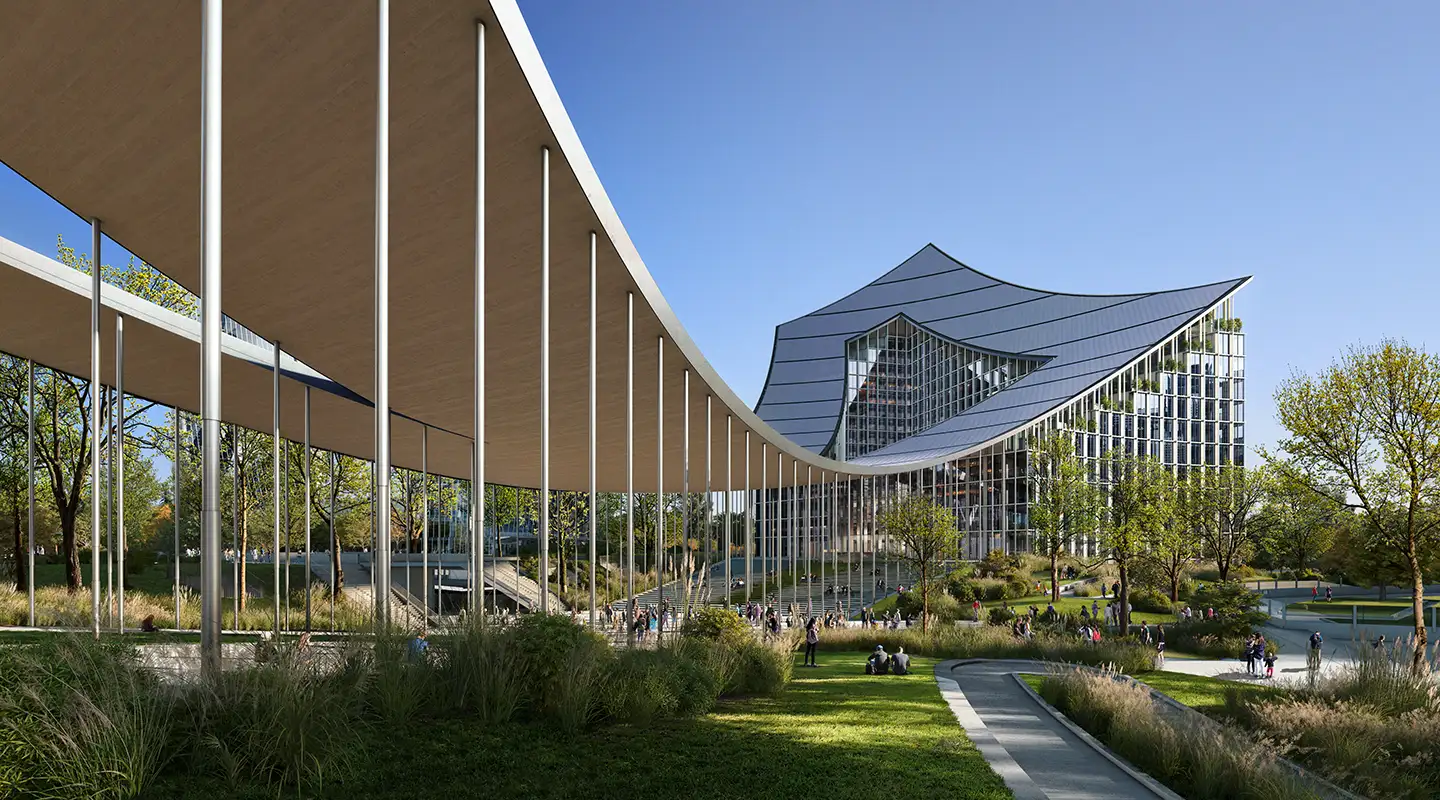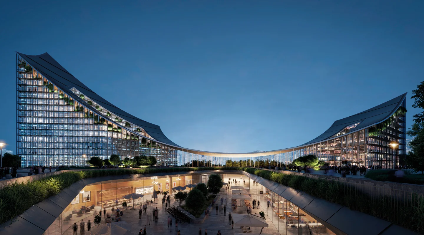 Su progetto dello studio danese Bjarke Ingels Group, la struttura è costituita da due volumi alti, di venti e dieci piani, connessi da un’unica copertura curvilinea che fa da cielo a un portico di scala gigante, per una lunghezza totale di oltre 200 metri.
